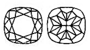 The CUSHION CUT diamond is an antique cut and is also referred to as Pillow cut or the Candlelight diamond. Cushion cut diamonds have larger facets and rounded corners than most cuts so as to increase their sparkle under candlelight.